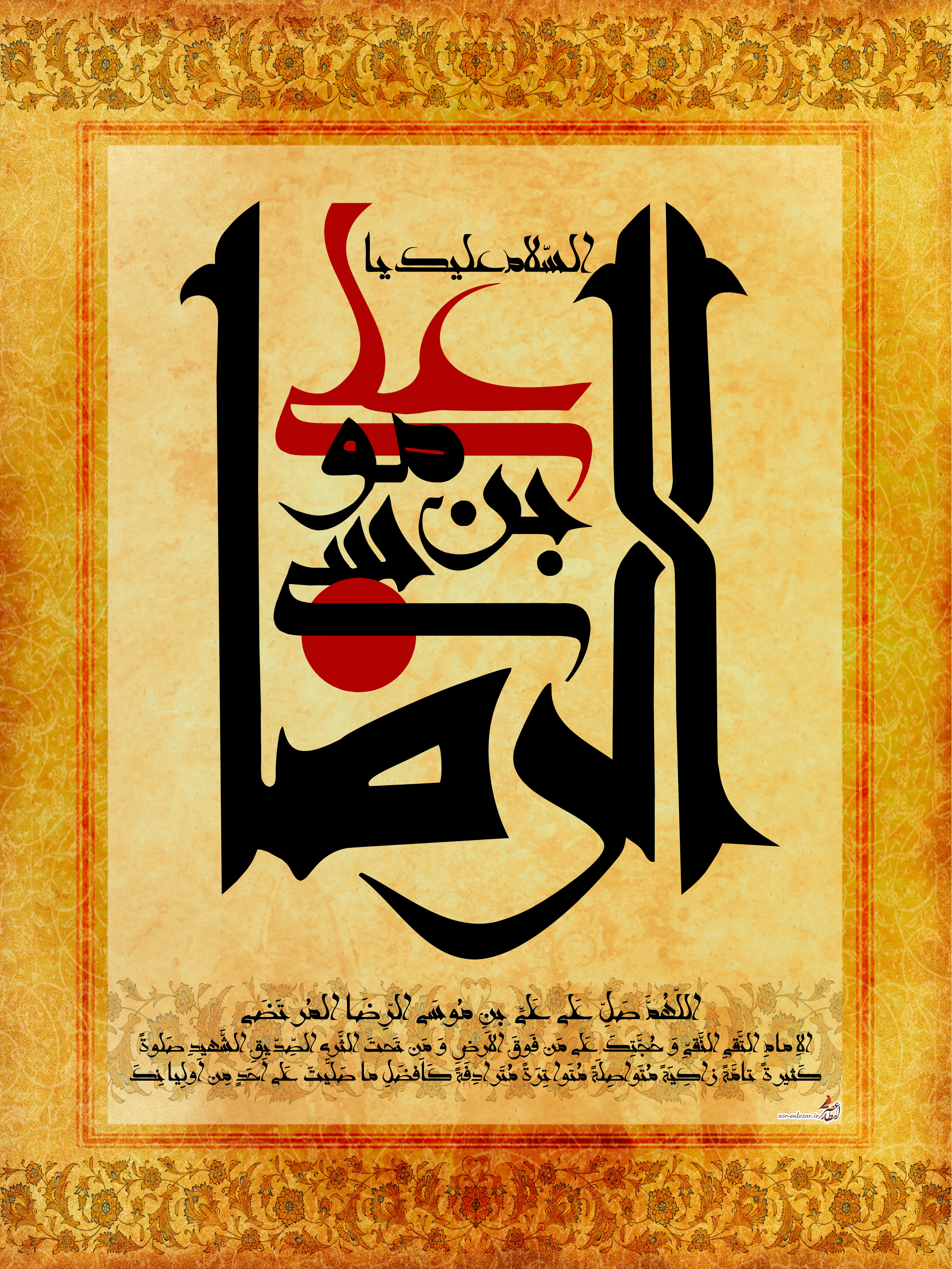 برای این طرح از خط انتظار برای خطاطی عبارت زیبای السلام علیک یا علی بن موسی الرضا و همچنین صلوات خاصه امام رضا (علیه السلام) استفاده کردم و فضای تصویر رو با نقوش اسلیمی زینت دادم.