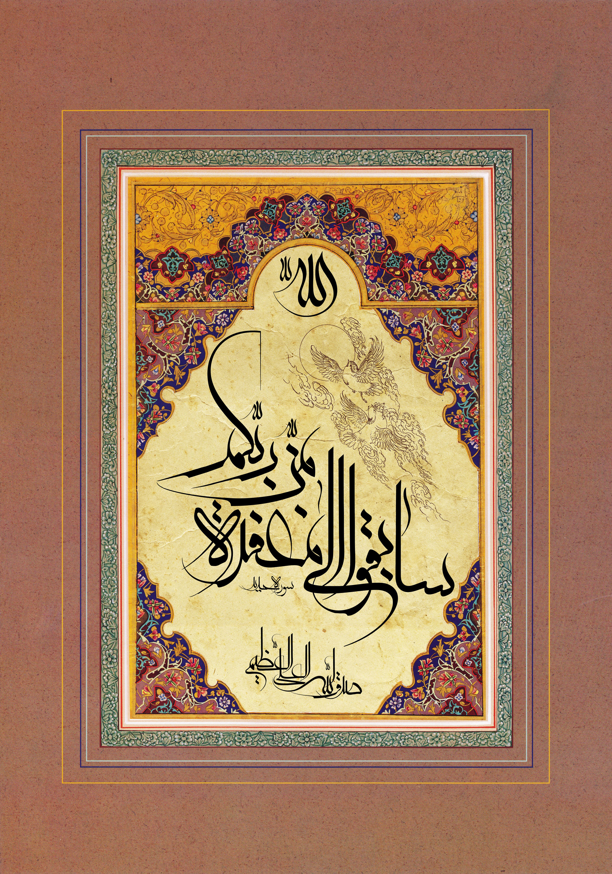 این تصویر مزین است به آیه شریفه « سابقوا الی مغفره من ربکم » که با خط معلی خطاطی شده است.