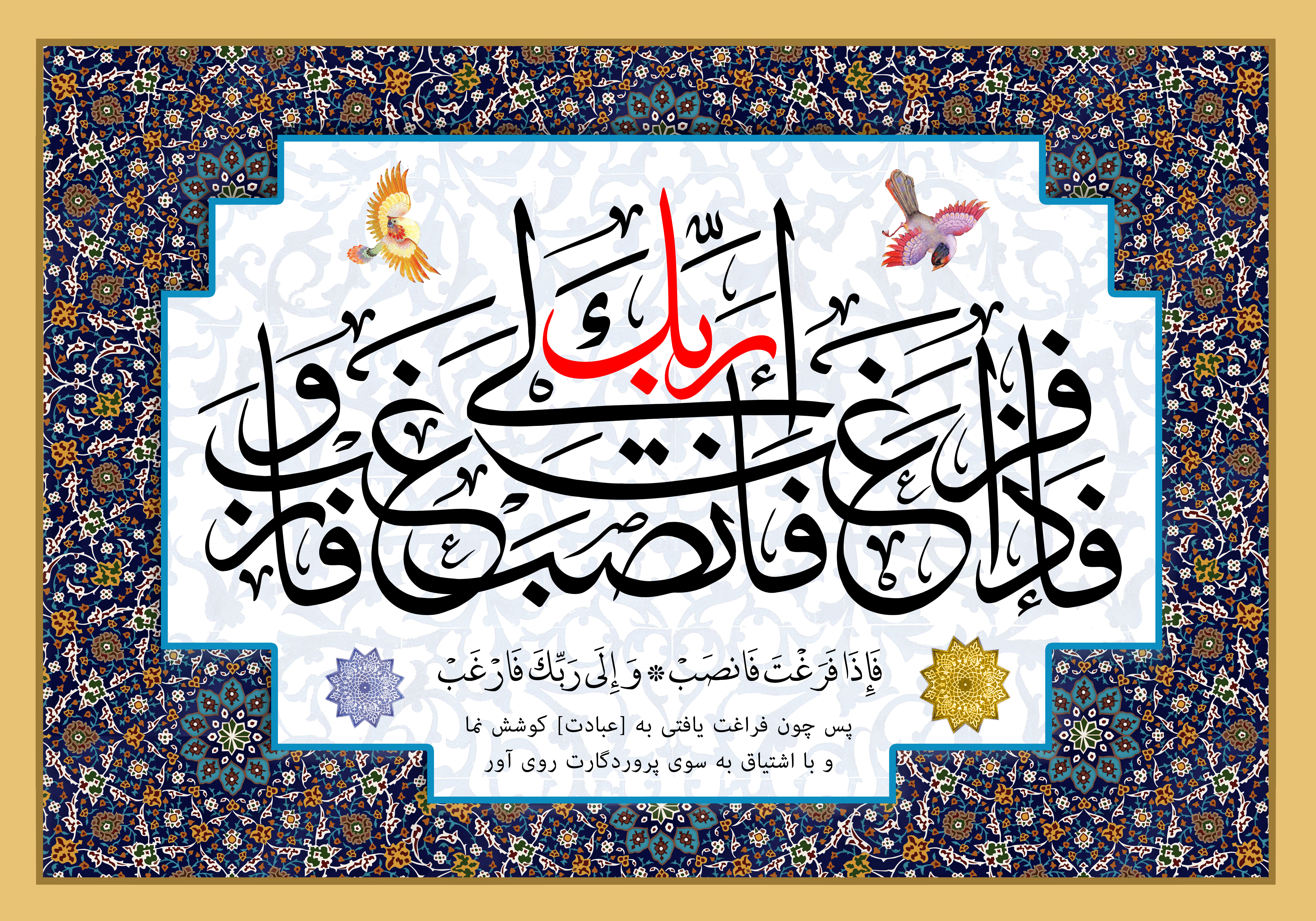 با توجه به فرارسیدن فصل تابستان و آغاز اوقات فراغت تصویر قرآنی امروز اختصاص دارد به آیات پایانی سوره الشرح که در این آیات آمده « فَإِذَا فَرَغْتَ فَانصَبْ * وَإِلَى رَبِّكَ فَارْغَبْ » « پس چون فراغت يافتى به [عبادت] كوش نما * و با اشتياق به سوى پروردگارت روى آور ».