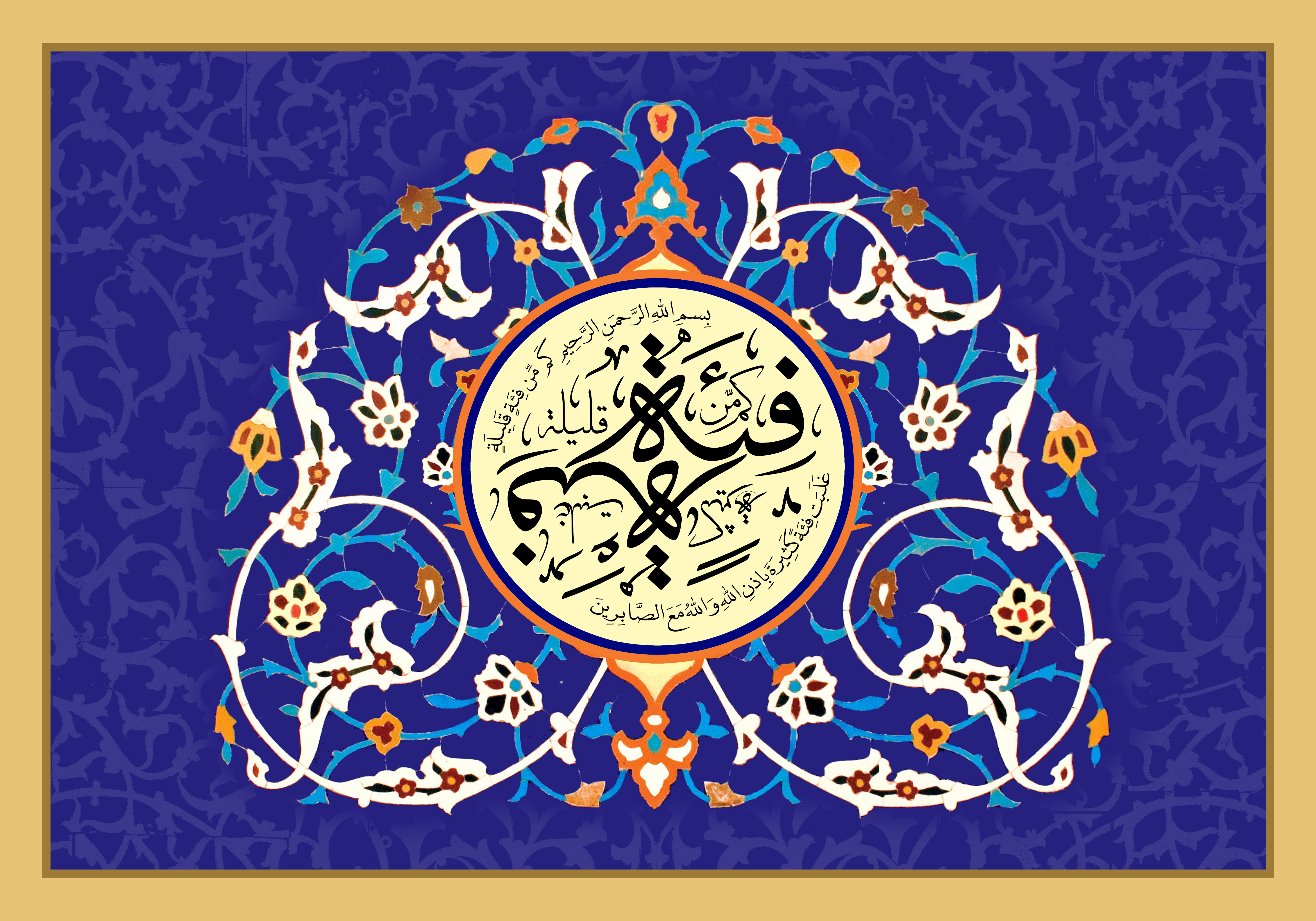 امروز نیز تصویری قرآنی خدمت شما تقدیم می کنم که این تصویر مزین است به فرازی از آیه 249 سوره بقره که در این فراز آمده: « كَم مِّن فِئَةٍ قَلِيلَةٍ غَلَبَتْ فِئَةً كَثِيرَةً بِإِذْنِ اللّهِ وَاللّهُ مَعَ الصَّابِرِينَ» – «بسا گروه اندكى كه به توفيق خدا بر گروه بسيارى پيروز شدند، و خدا با صابران است».