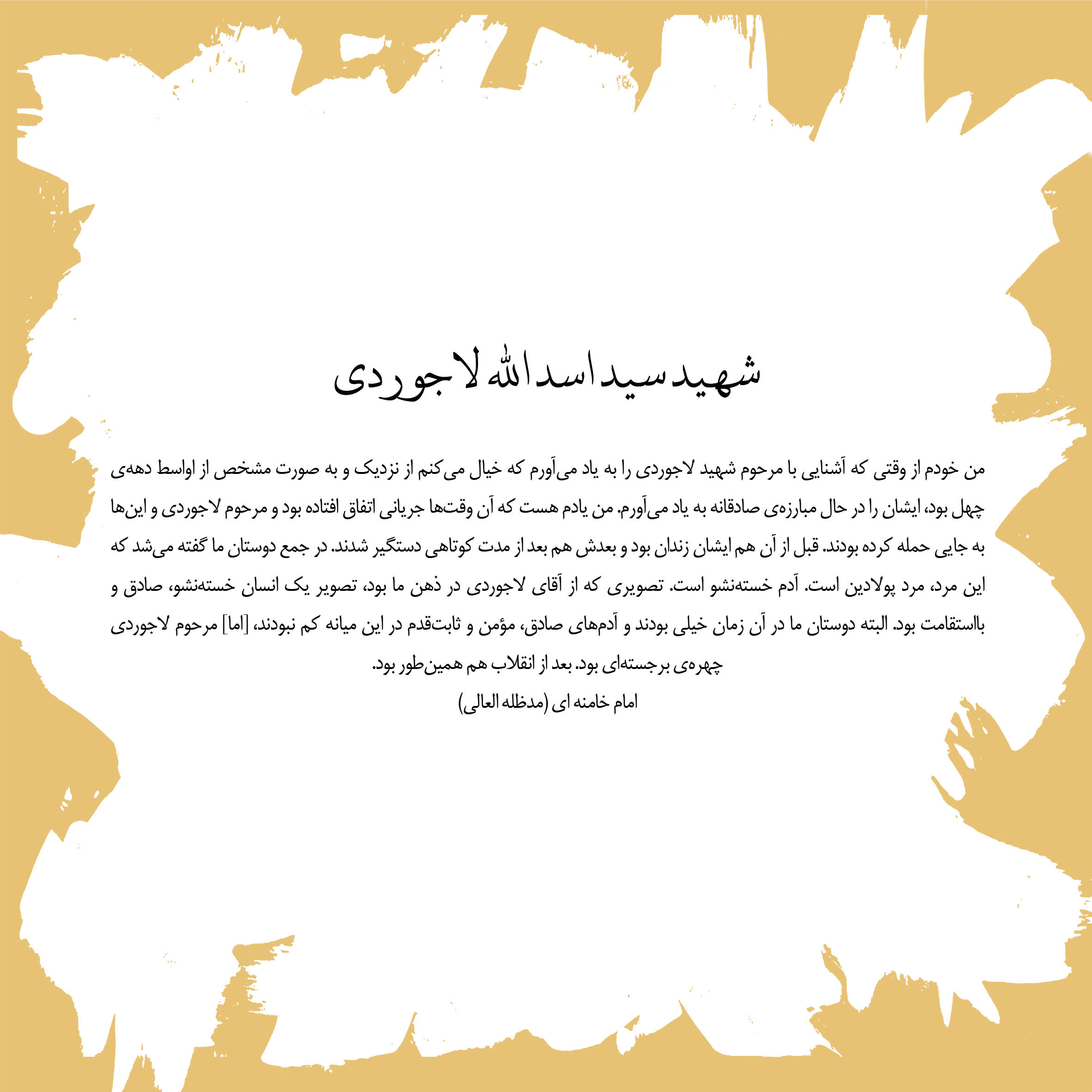 شما گرامیان می توانید از این مجموعه برای تابلوی اعلانات مسجد و یا محل های دیگر و یا در نشریات و… استفاده کنید در این صفحه از مجموعه یک از هزاران از تعبیر امام خامنه ای عزیز درباره شهید لاجوردی استفاده کردم که ایشان فرموده اند: