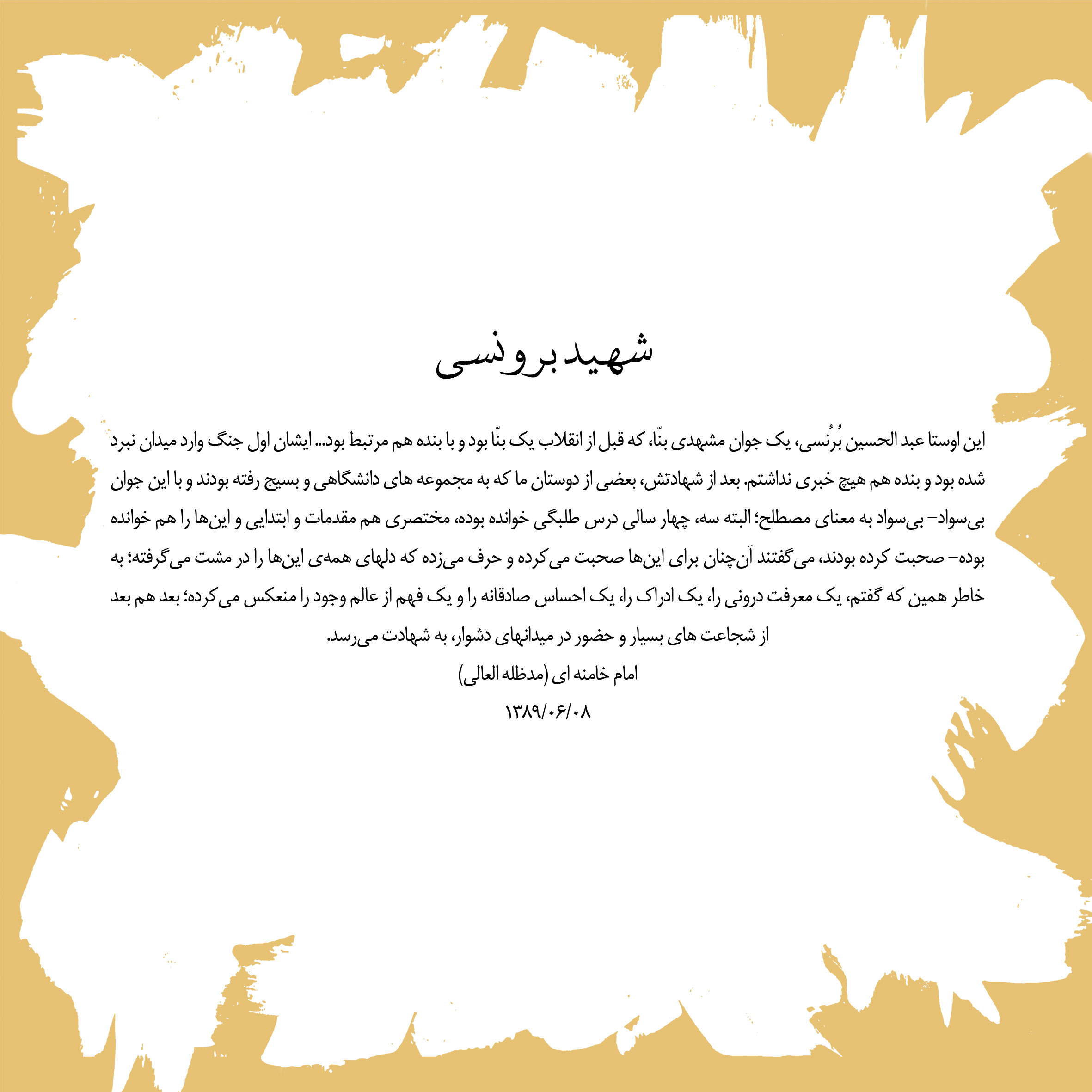 شهید والامقامی که در صفحه شانزدهم مجموعه یک از هزاران به زیارتش می رویم شهید عبدالحسین برونسی است و بیانات امام خامنه ای (مدظله العالی) درباره این شهید: