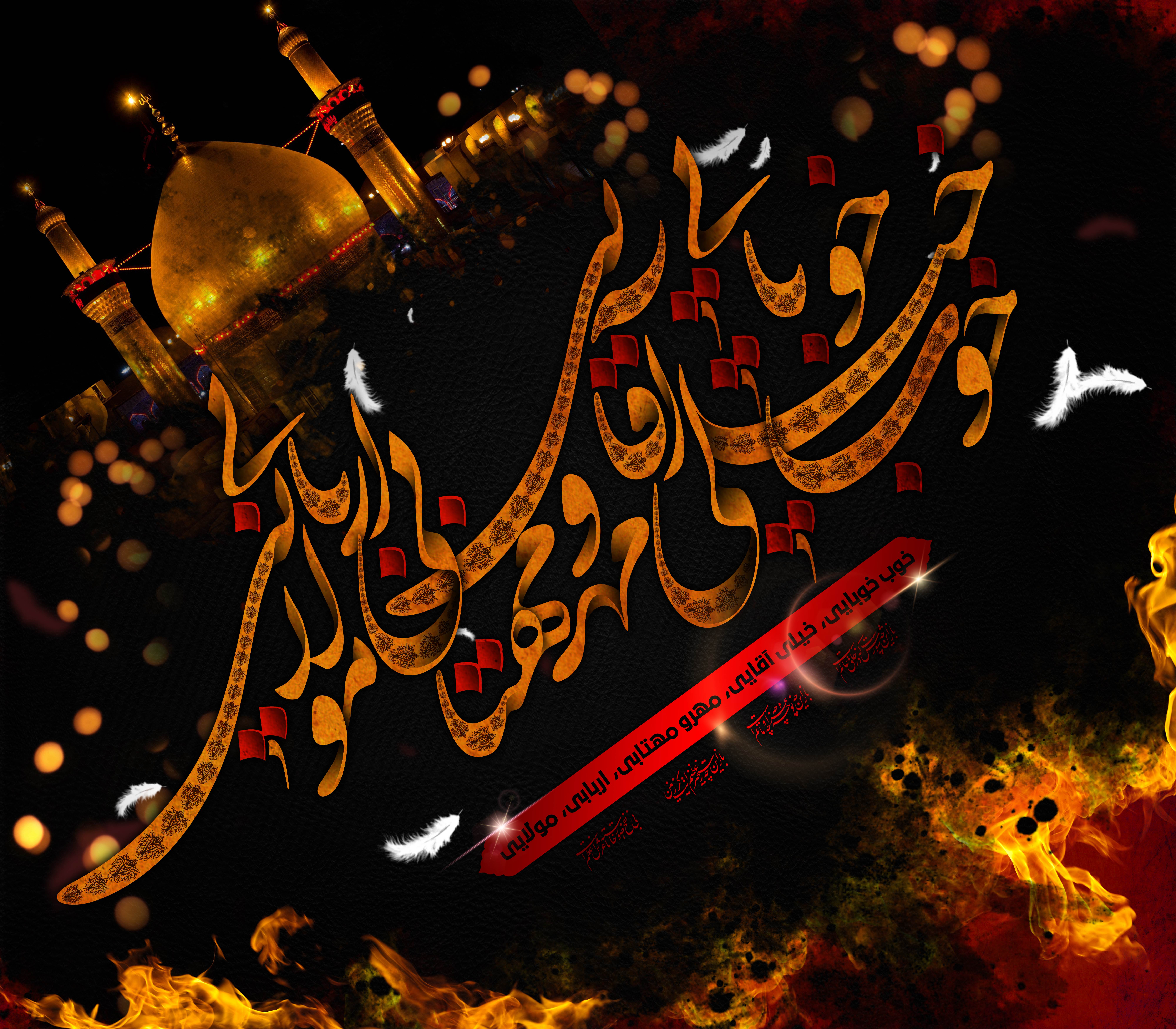 این تصویر مزین است به عبارت “خوب خوبایی، خیلی آقایی، مهر و مهتابی، مولایی، اربابی” که از مداحی های محرم سال ۹۵ حاج محمود کریمی گرفته شده و به این صورت خطاطی و طراحی شده است.