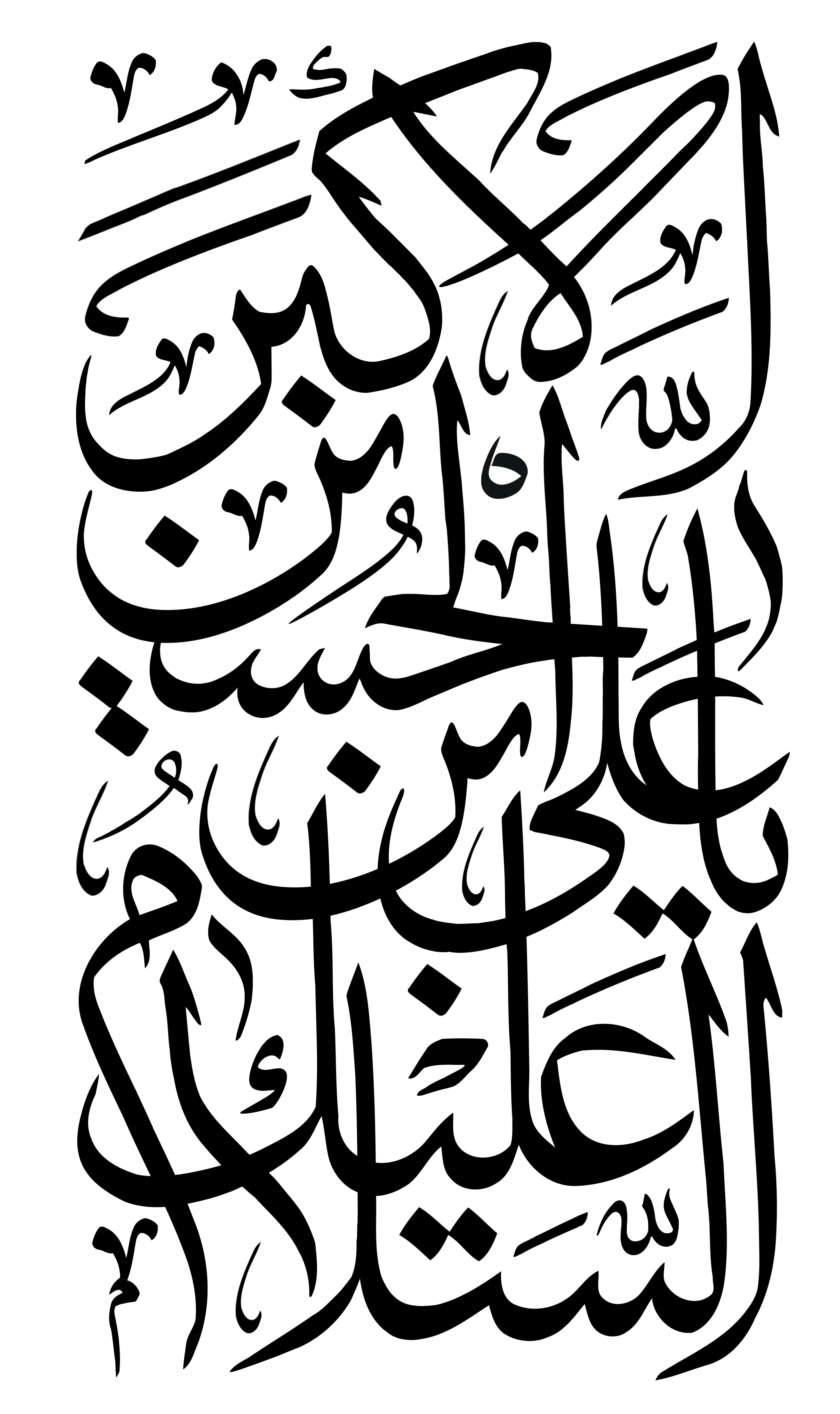 به همین مناسبت کتیبه ای عمودی خدمت شما تقدیم می کنم. این کتیبه مزین است به عبارات «السلام علیک یا حسین بن علی الشهید» و «السلام علیک یا زینب الکبری» و «السلام علیک یا اباالفضل العباس» و «السلام علیک یا علی الاکبر» و «السلام علیک یا علی الاصغر» و «السلام علیک یا رقیه بنت الحسین»