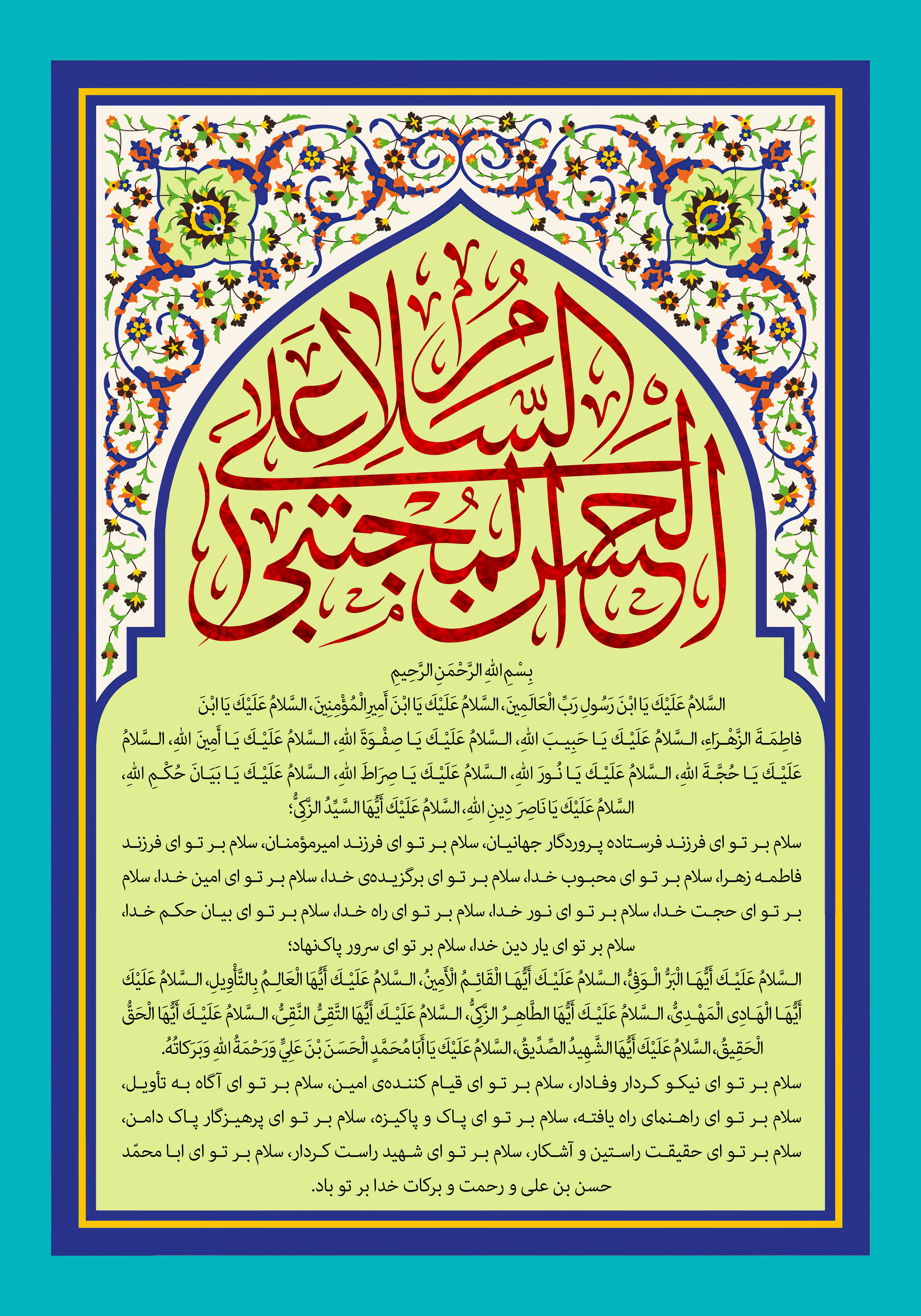 السَّلامُ عَلَیْکَ أَیُّهَا الْبَرُّ الْوَفِىُّ، السَّلامُ عَلَیْکَ أَیُّهَا الْقَائِمُ الْأَمِینُ، السَّلامُ عَلَیْکَ أَیُّهَا الْعَالِمُ بِالتَّأْوِیلِ، السَّلامُ عَلَیْکَ أَیُّهَا الْهَادِى الْمَهْدِىُّ، السَّلامُ عَلَیْکَ أَیُّهَا الطَّاهِرُ الزَّکِىُّ، السَّلامُ عَلَیْکَ أَیُّهَا التَّقِىُّ النَّقِىُّ، السَّلامُ عَلَیْکَ أَیُّهَا الْحَقُّ الْحَقِیقُ، السَّلامُ عَلَیْکَ أَیُّهَا الشَّهِیدُ الصِّدِّیقُ، السَّلامُ عَلَیْکَ یَا أَبَا مُحَمَّدٍ الْحَسَنَ بْنَ عَلِیٍّ وَرَحْمَهُ اللّٰهِ وَبَرَکاتُهُ.
