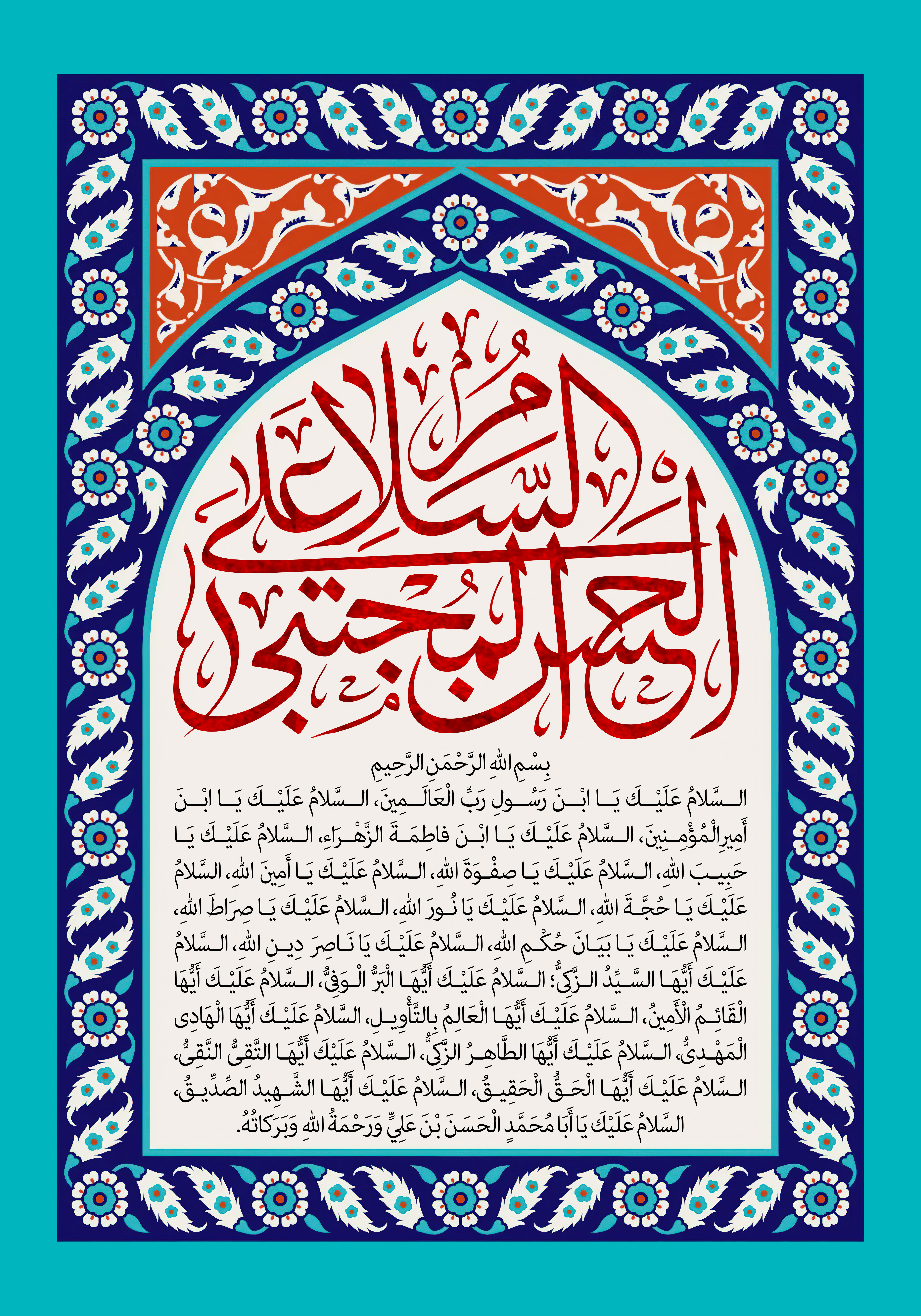 السَّلامُ عَلَیْکَ یَا ابْنَ رَسُولِ رَبِّ الْعَالَمِینَ، السَّلامُ عَلَیْکَ یَا ابْنَ أَمِیرِالْمُؤْمِنِینَ، السَّلامُ عَلَیْکَ یَا ابْنَ فاطِمَهَ الزَّهْرَاءِ، السَّلامُ عَلَیْکَ یَا حَبِیبَ اللّٰهِ، السَّلامُ عَلَیْکَ یَا صِفْوَهَ اللّٰهِ، السَّلامُ عَلَیْکَ یَا أَمِینَ اللّٰهِ، السَّلامُ عَلَیْکَ یَا حُجَّهَ اللّٰهِ، السَّلامُ عَلَیْکَ یَا نُورَ اللّٰهِ، السَّلامُ عَلَیْکَ یَا صِرَاطَ اللّٰهِ، السَّلامُ عَلَیْکَ یَا بَیَانَ حُکْمِ اللّٰهِ، السَّلامُ عَلَیْکَ یَا نَاصِرَ دِینِ اللّٰهِ، السَّلامُ عَلَیْکَ أَیُّهَا السَّیِّدُ الزَّکِىُّ؛ السَّلامُ عَلَیْکَ أَیُّهَا الْبَرُّ الْوَفِىُّ، السَّلامُ عَلَیْکَ أَیُّهَا الْقَائِمُ الْأَمِینُ، السَّلامُ عَلَیْکَ أَیُّهَا الْعَالِمُ بِالتَّأْوِیلِ، السَّلامُ عَلَیْکَ أَیُّهَا الْهَادِى الْمَهْدِىُّ، السَّلامُ عَلَیْکَ أَیُّهَا الطَّاهِرُ الزَّکِىُّ، السَّلامُ عَلَیْکَ أَیُّهَا التَّقِىُّ النَّقِىُّ، السَّلامُ عَلَیْکَ أَیُّهَا الْحَقُّ الْحَقِیقُ، السَّلامُ عَلَیْکَ أَیُّهَا الشَّهِیدُ الصِّدِّیقُ، السَّلامُ عَلَیْکَ یَا أَبَا مُحَمَّدٍ الْحَسَنَ بْنَ عَلِیٍّ وَرَحْمَهُ اللّٰهِ وَبَرَکاتُهُ.