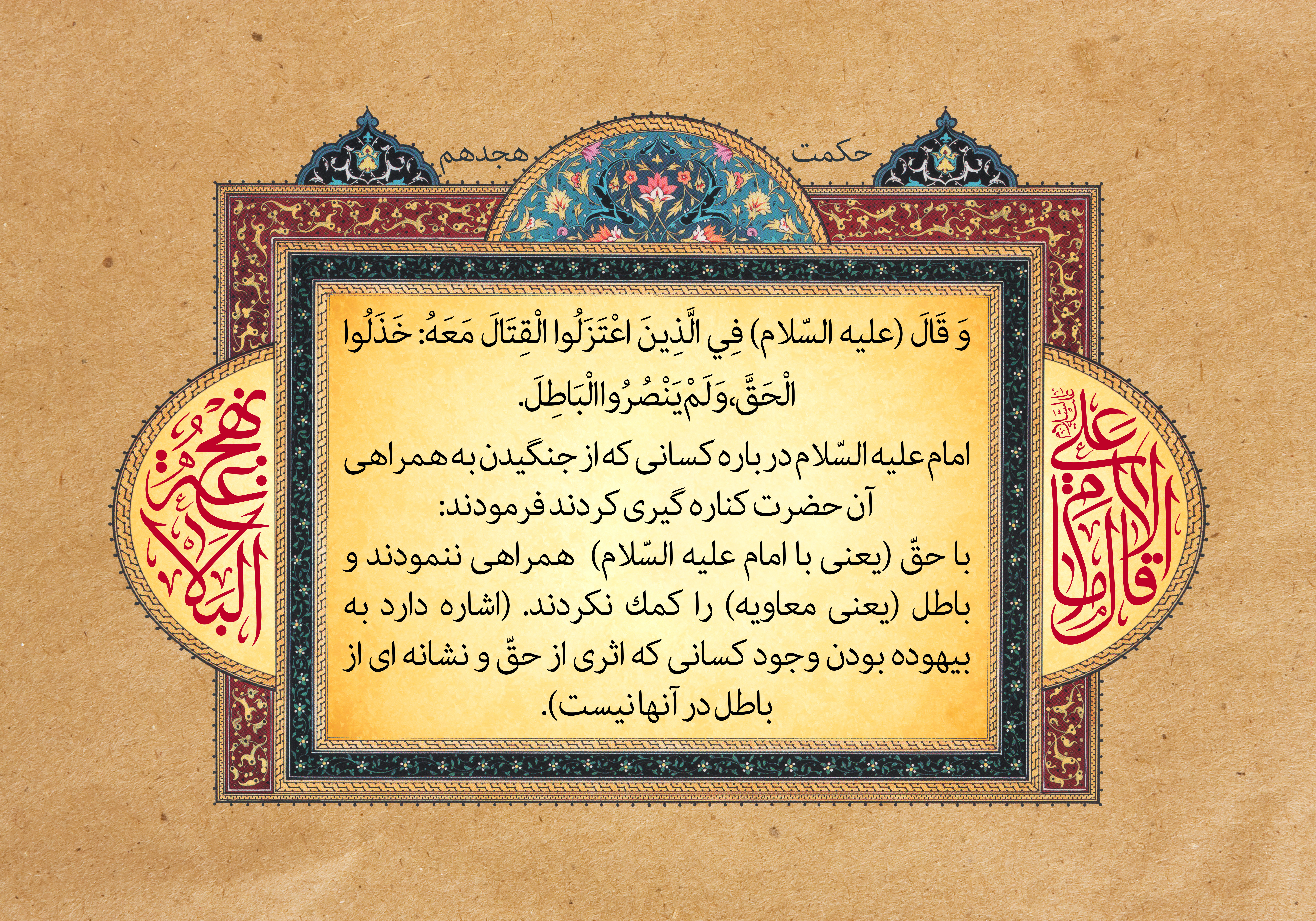 وَ قَالَ (علیه السلام) فِی الَّذِینَ اعْتَزَلُوا الْقِتَالَ مَعَهُ: خَذَلُوا الْحَقَّ، وَ لَمْ یَنْصُرُوا الْبَاطِلَ.