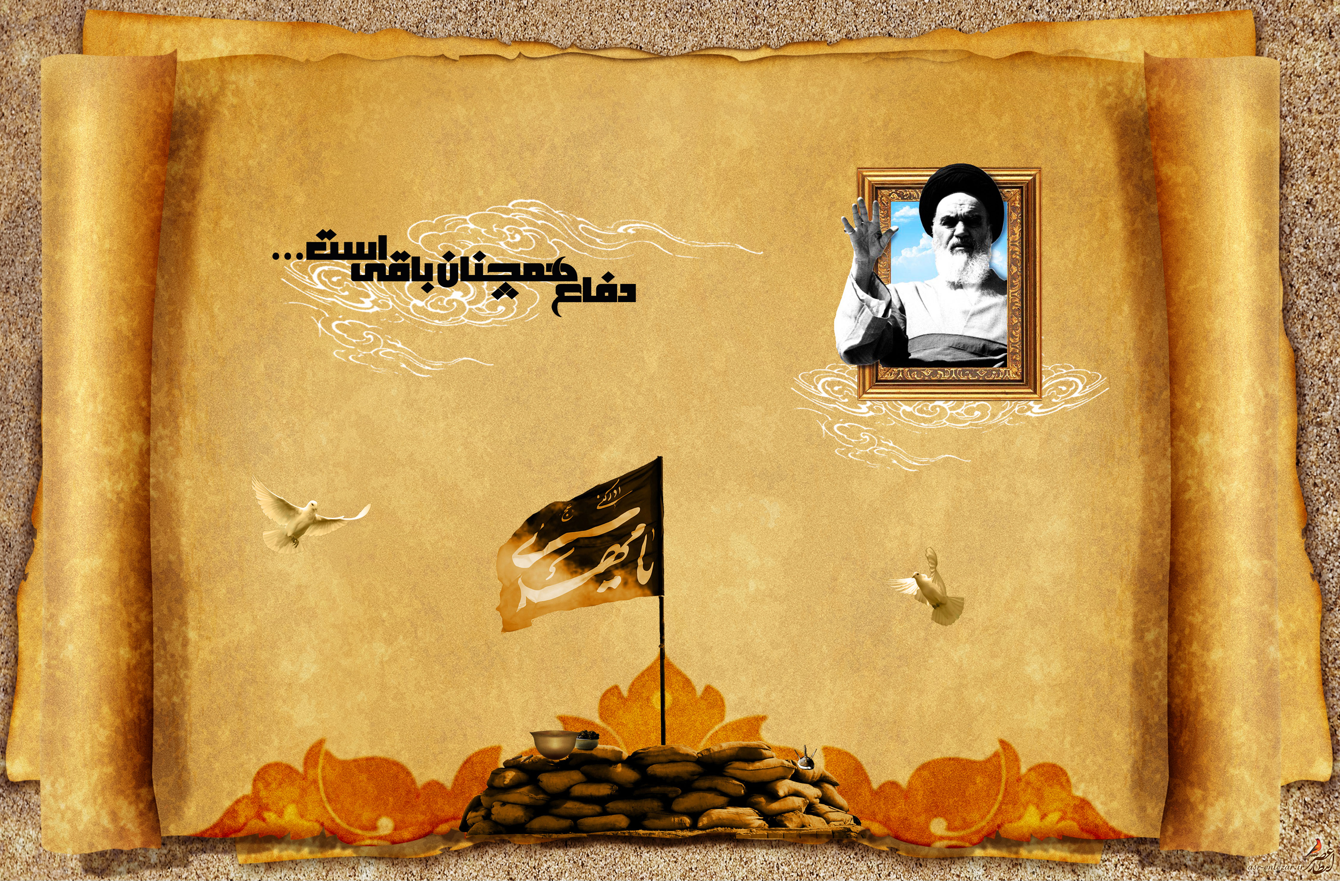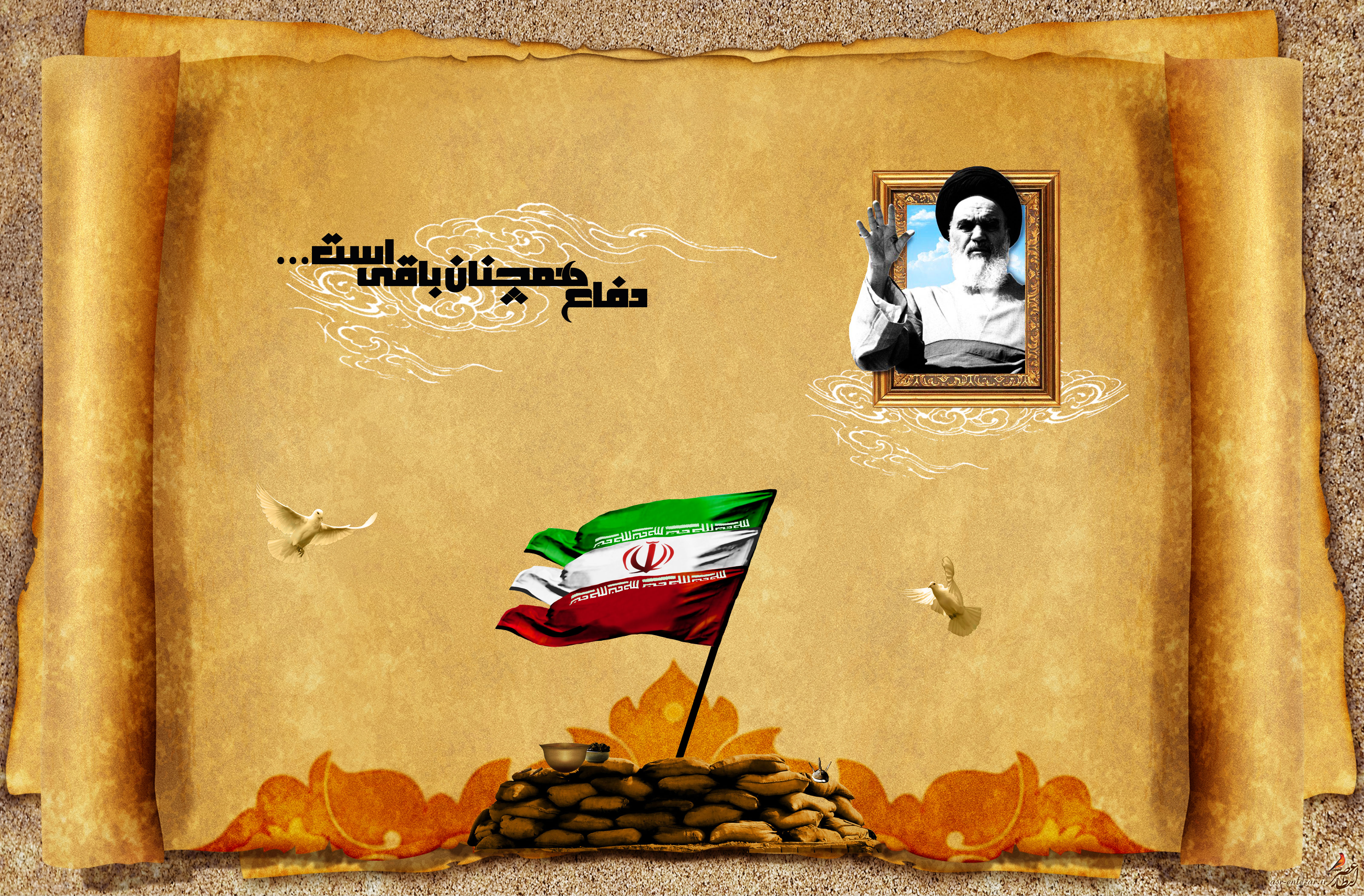 سومین تصویری که به مناسبت هفته دفاع مقدس خدمتتون تقدیم می کنم طرحی است همراه با تصویر زیبای امام خمینی (ره) و جمله آشنای ((دفاع همچنان باقی است…)). برای طراحی این تصویر ابتدا از پرچمی مزین به ذکر یا مهدی (عجل الله تعالی فرجه الشریف) بر روی خاکریز استفاده کردم و بعد تصمیم گرفتم به جای این پرچم، پرچم ایران را قرار دهم. به همین خاطر چند پرچم طراحی کردم و در نهایت یکی را برای این تصویر انتخاب کردم که نتیجه کار رو خدمتتون تقدیم می کنم.